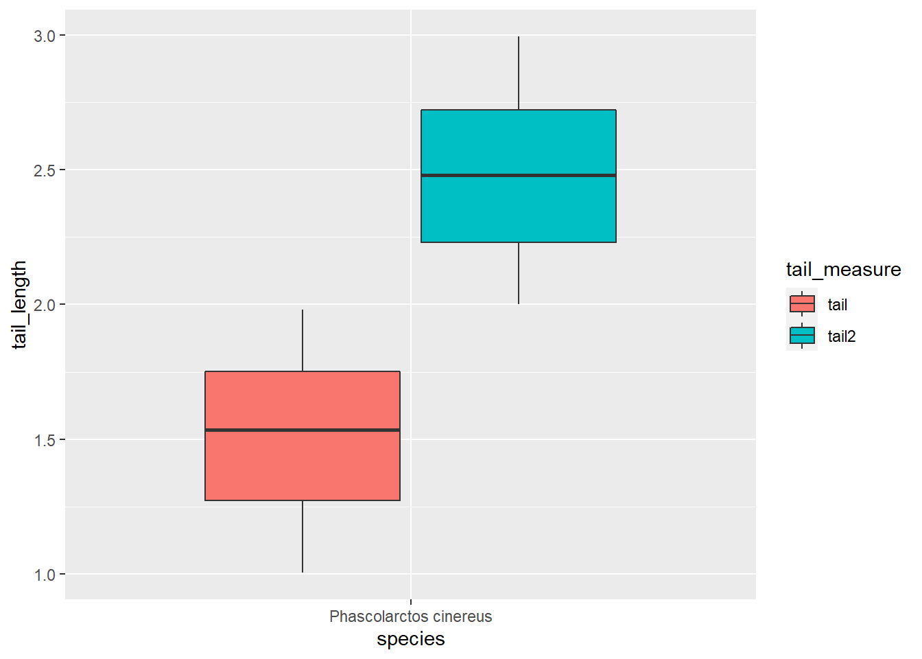 ggplot(koala_pivot, aes(x=species, y=tail_length, fill = tail_measure)) +