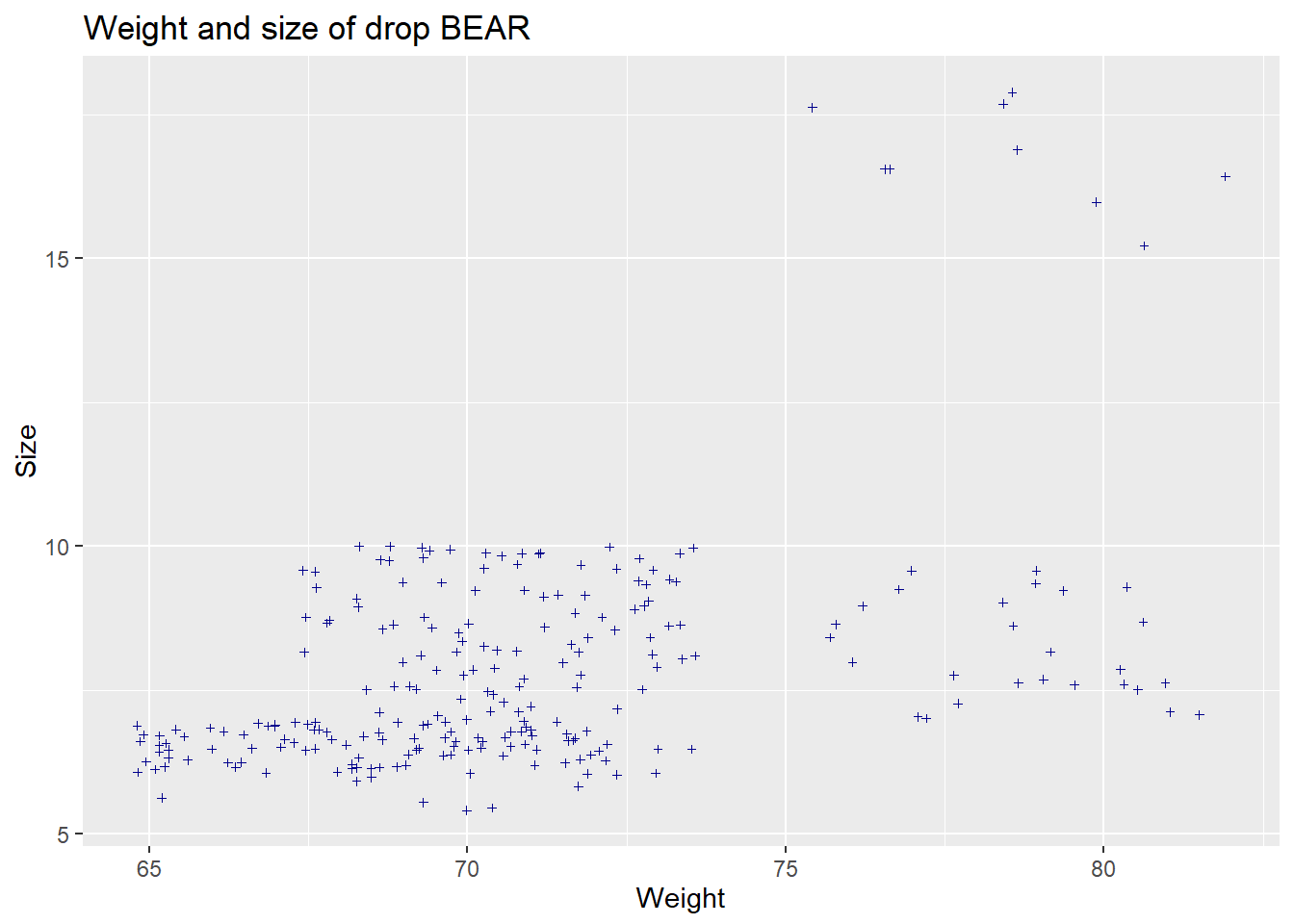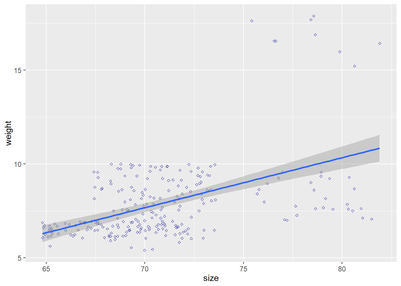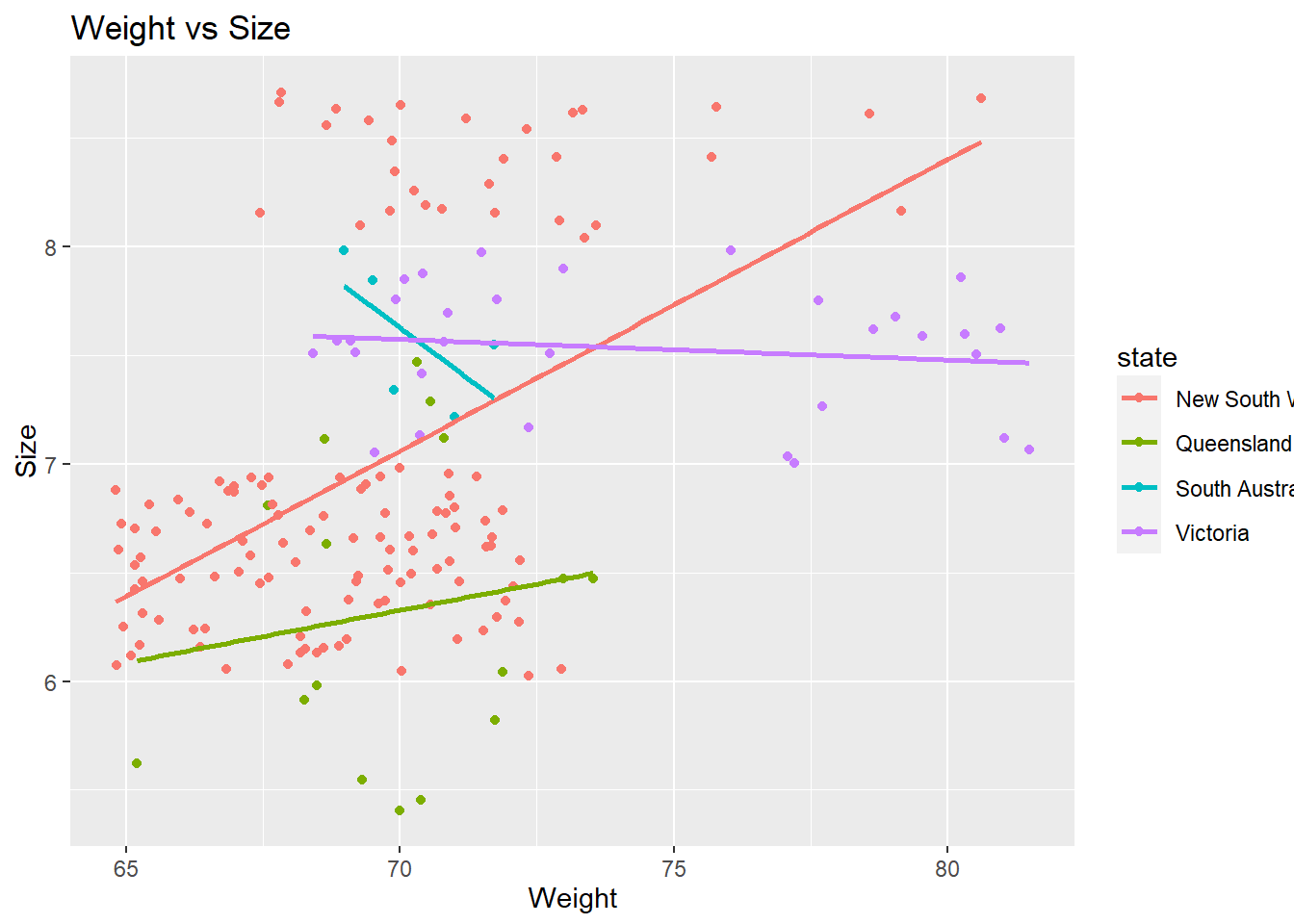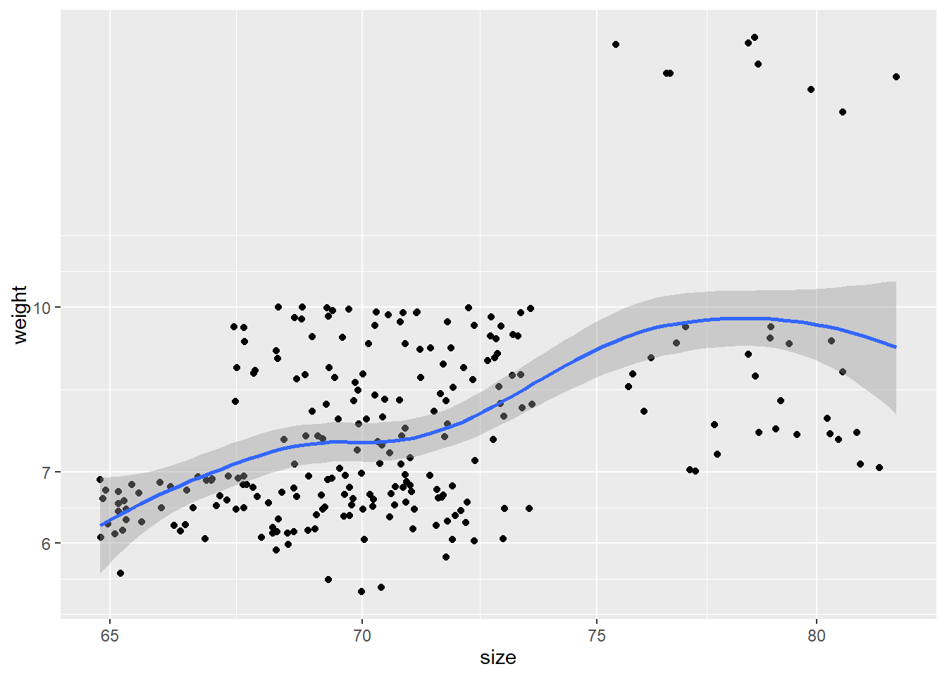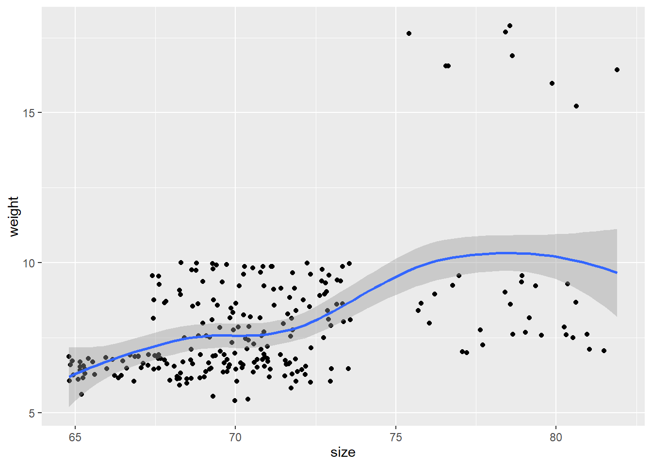 geom_smooth(method='glm', se=F)+labs(title="Weight vs Size", x= "Weight", y="Size")## `geom_smooth()` using formula 'y ~ x'