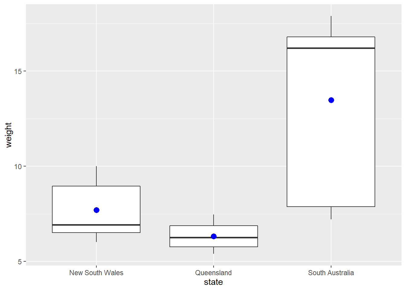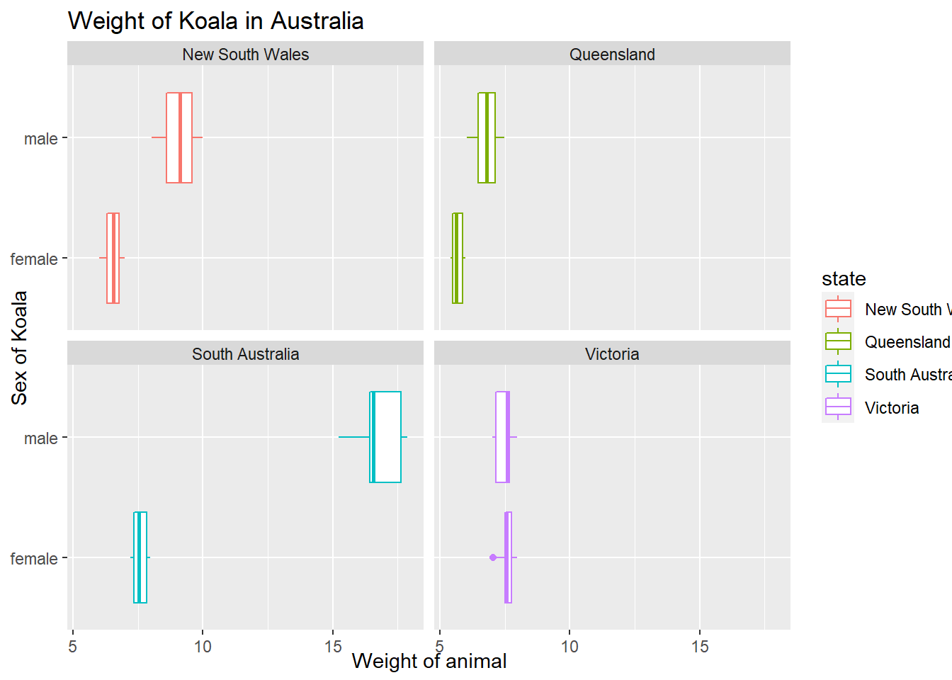 - plot the weights of koalas from all states except Victoria as a boxplot!