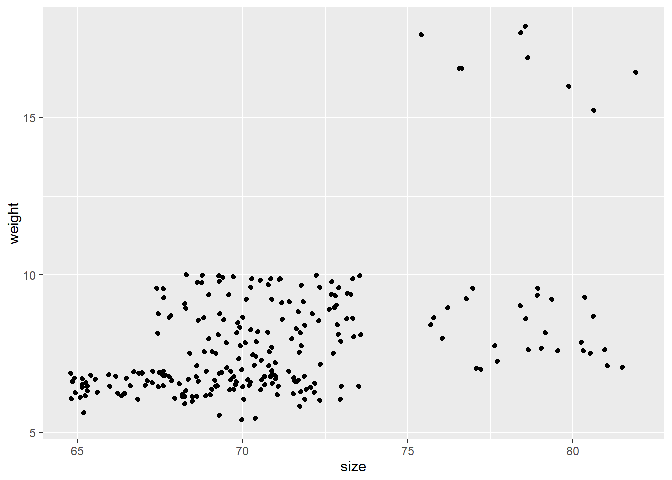 p <- ggplot(data = koala, mapping = aes(x = size, y = weight))5.3 geom_point