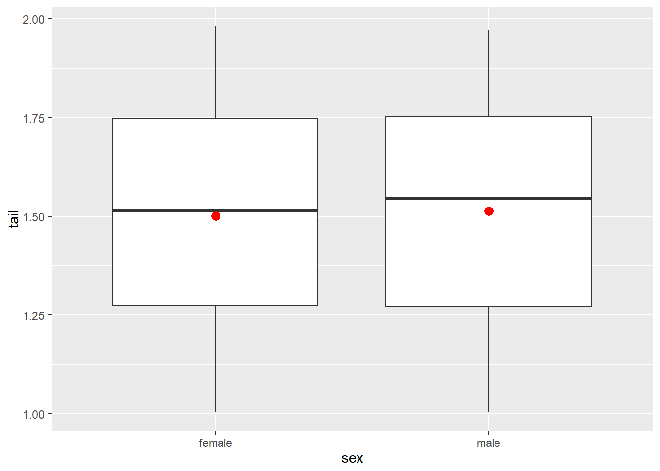 ggplot(koala, aes(x=sex,y=tail))+geom_boxplot()+
