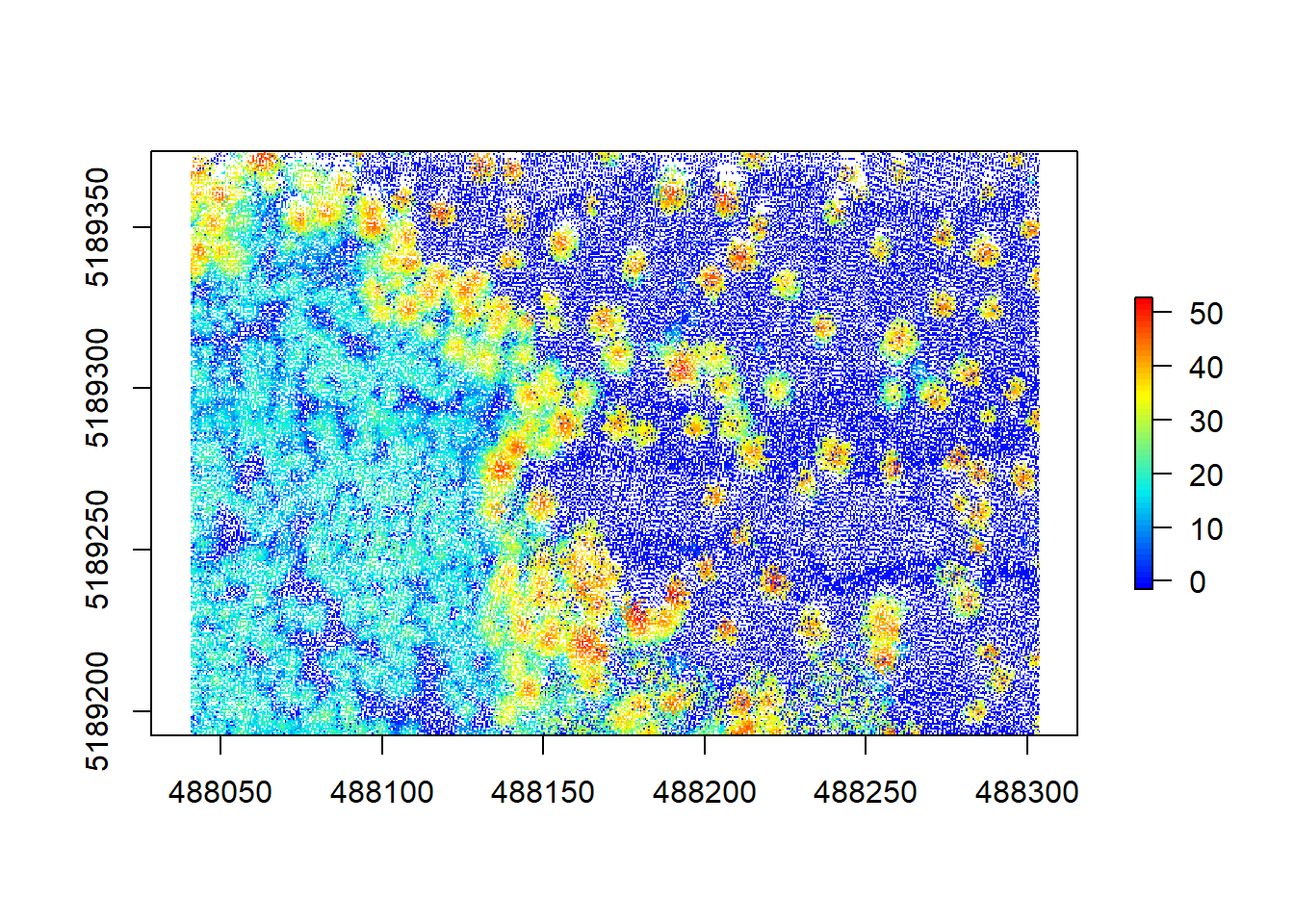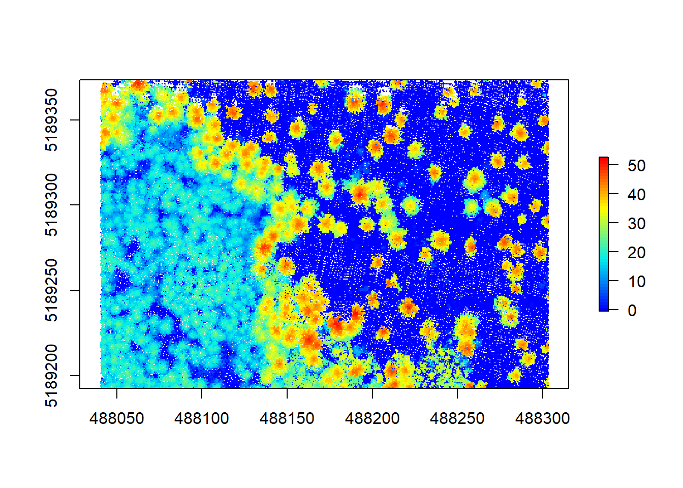 plot(forest, colorPalette = heat.colors(50))10.4 Step 2. Computing a canopy height model