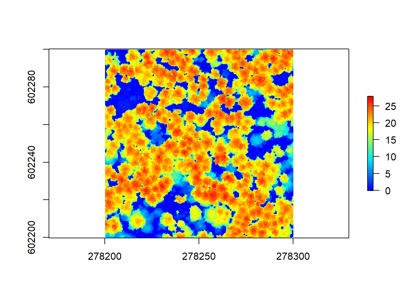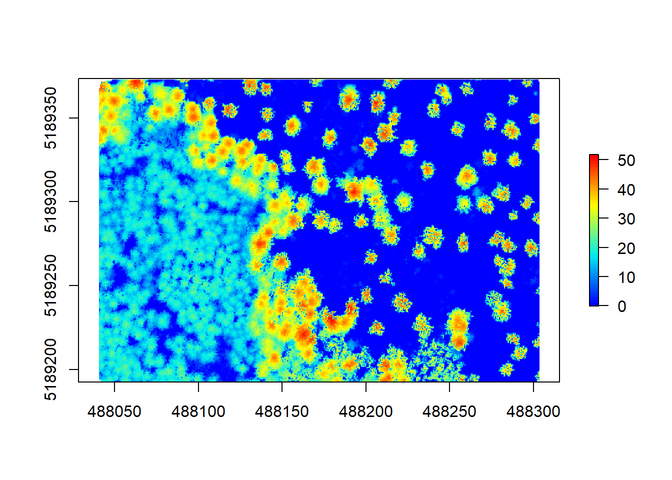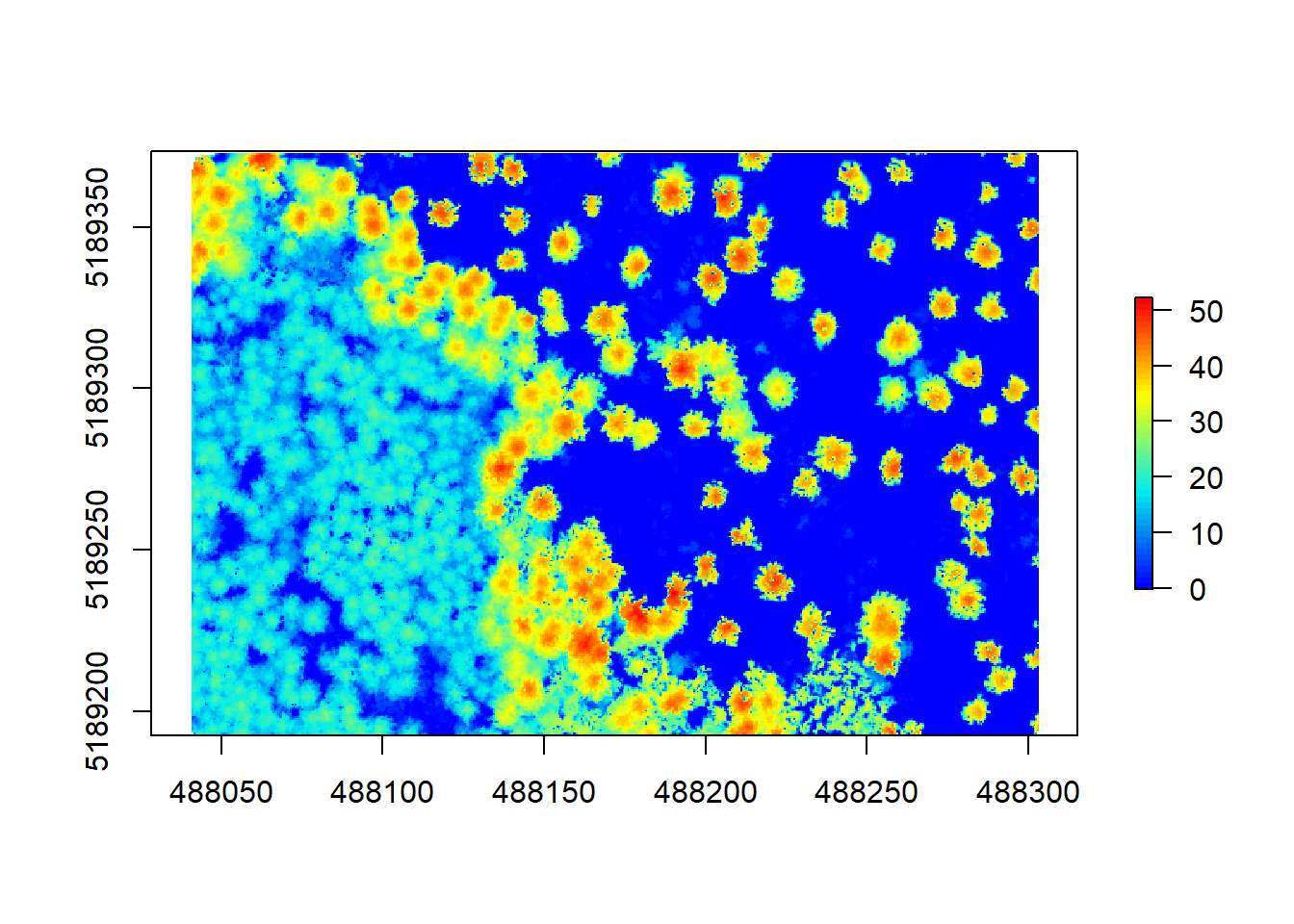 chm <- grid_canopy(raw_forest_norm, 0.5, algo) # smoothing post-process (here e.g. two pass (running focal twice), 3x3 median convolution)