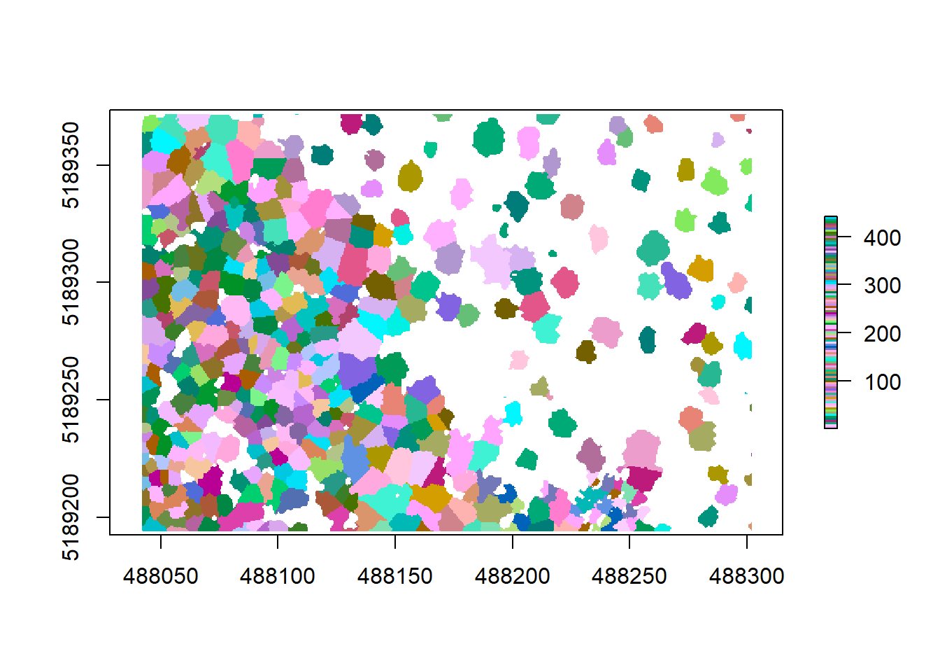 Comparing this raster to our previous ones, we can see that the ‘fuzziness’ around the edged has been removed. This will aid the next algorithm in finding the trees better. The segmentation using a CHM and normalized pointcloud is implemented in lidR using lastrees(). We will be using a watershed algorithm with a 4 meter threshold. A watershed transformation treats our raster like a topographic map and finds the lines in ‘depressions’ between our trees, treating the tree tops or crowns as ‘ridges’.
